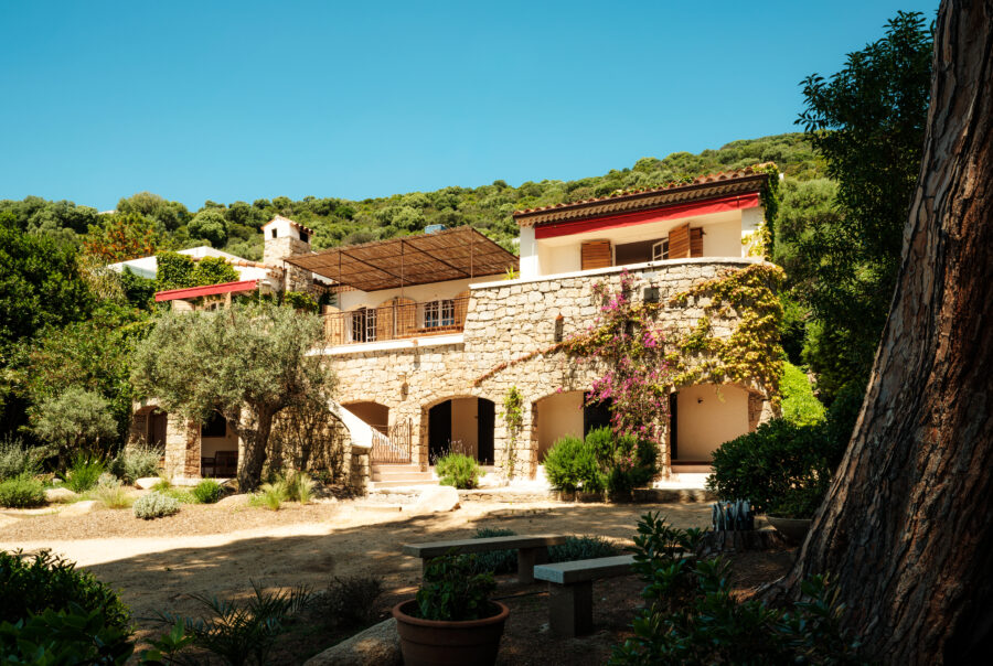 La pierre, rappelant les murets de pierres sèches typiques de la Corse, confère à l’ensemble une texture brute et authentique, tandis que le verre et l’acier soulignent la légèreté et l’ouverture des espaces.